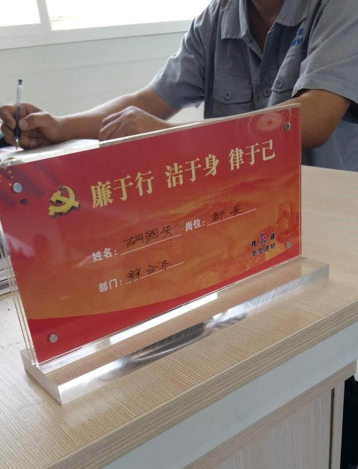日前,陜建新型建材有限公司在學習貫徹《中國共產(chǎn)黨廉潔自律準則》和《中國共產(chǎn)黨紀律處分條例》中,開拓思路、創(chuàng)新形式,為黨員領(lǐng)導干部制發(fā)了廉潔自律警示桌牌。 廉潔桌牌正面印有“廉于行,潔于身,律于己”警句及姓名、崗位、部門;背面印有“黨員廉潔自律規(guī)范”。要求全體黨員干部以黨員廉潔自律規(guī)范條款規(guī)定為內(nèi)容,自覺提升思想道德境界,堅持公私分明,先公后私,克己奉公;堅持崇廉拒腐,清白做人,干凈做事;堅持尚儉戒奢,艱苦樸素,勤儉節(jié)約;堅持吃苦在前,享受在后,甘于奉獻。廉政桌牌,彰顯著新型建材濃厚的廉政文化氛圍。