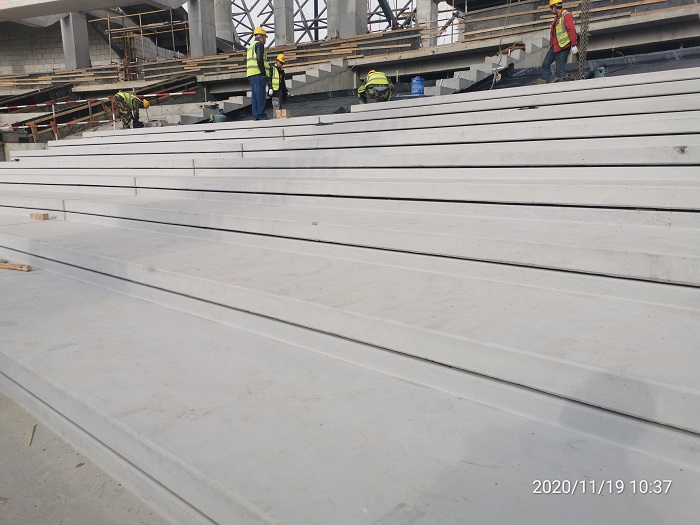 蘭州項(xiàng)目預(yù)制看臺的制作、安裝均由我司承擔(dān),公司組織專業(yè)技術(shù)人員針對蘭州項(xiàng)目進(jìn)行深入地研討分析,據(jù)了解,該項(xiàng)目的安裝控制難點(diǎn)共有4點(diǎn): 一是施工條件復(fù)雜;項(xiàng)目現(xiàn)場涉及與各方施工配合及交叉作業(yè),施工條件復(fù)雜,由于工期緊張,主體結(jié)構(gòu),鋼結(jié)構(gòu),預(yù)制看臺安裝同步施工,給整個預(yù)制看臺安裝帶來極大挑戰(zhàn),尤其是測量放線工作,看臺安裝前需提前進(jìn)行精準(zhǔn)放線定位以便于吊裝精準(zhǔn)定位,但預(yù)制構(gòu)件與現(xiàn)澆交叉施工工序原因,部分位置施工現(xiàn)場已經(jīng)進(jìn)行現(xiàn)澆處理,但該位置恰好遮擋預(yù)制構(gòu)件放線視線,導(dǎo)致現(xiàn)場放線時,視野阻礙、遮擋,對放線操作人員以及放線定位精準(zhǔn)度的要求大大提升,測量放線難度大幅度增加。 二是溫差變化大,對安裝節(jié)點(diǎn)要求高;本項(xiàng)目為清水看臺板,與主體混凝土結(jié)構(gòu)梁的連接構(gòu)造是該項(xiàng)目設(shè)計(jì)與施工的重點(diǎn),在滿足連接構(gòu)造在極限狀態(tài)和正常使用狀態(tài)條件下可靠和安全的前提下,還考慮到連接構(gòu)造滿足看臺施工安裝便捷性和吸收變形能力要求;同時在四季和晝夜溫差變化的極限狀態(tài),連接節(jié)點(diǎn)要具有適應(yīng)看臺板熱脹冷縮變形的能力。這對現(xiàn)場施工要求極高,需要根據(jù)氣溫變化對節(jié)點(diǎn)處做相應(yīng)處理。 三是安裝精準(zhǔn)度要求高;安裝過程中的安裝尺寸精度控制為一大技術(shù)控制要點(diǎn)。由于預(yù)制構(gòu)件均為定制尺寸,為減少安裝時累計(jì)誤差,需嚴(yán)格控制連接節(jié)點(diǎn)之間的縫隙尺寸,安裝過程中需要實(shí)時利用水準(zhǔn)儀,靠尺等工具不斷地調(diào)整與檢查,保證安裝縫隙均勻、平整,尺寸準(zhǔn)確,不可失之毫厘,并確保其安裝縫隙與上下看臺之間的縫隙一致。 四是實(shí)時成品保護(hù);預(yù)制構(gòu)件安裝完成之后,為防止后續(xù)二次施工污染,需采用相應(yīng)的保護(hù)措施,安裝過程中需隨時跟進(jìn)成品保護(hù)。