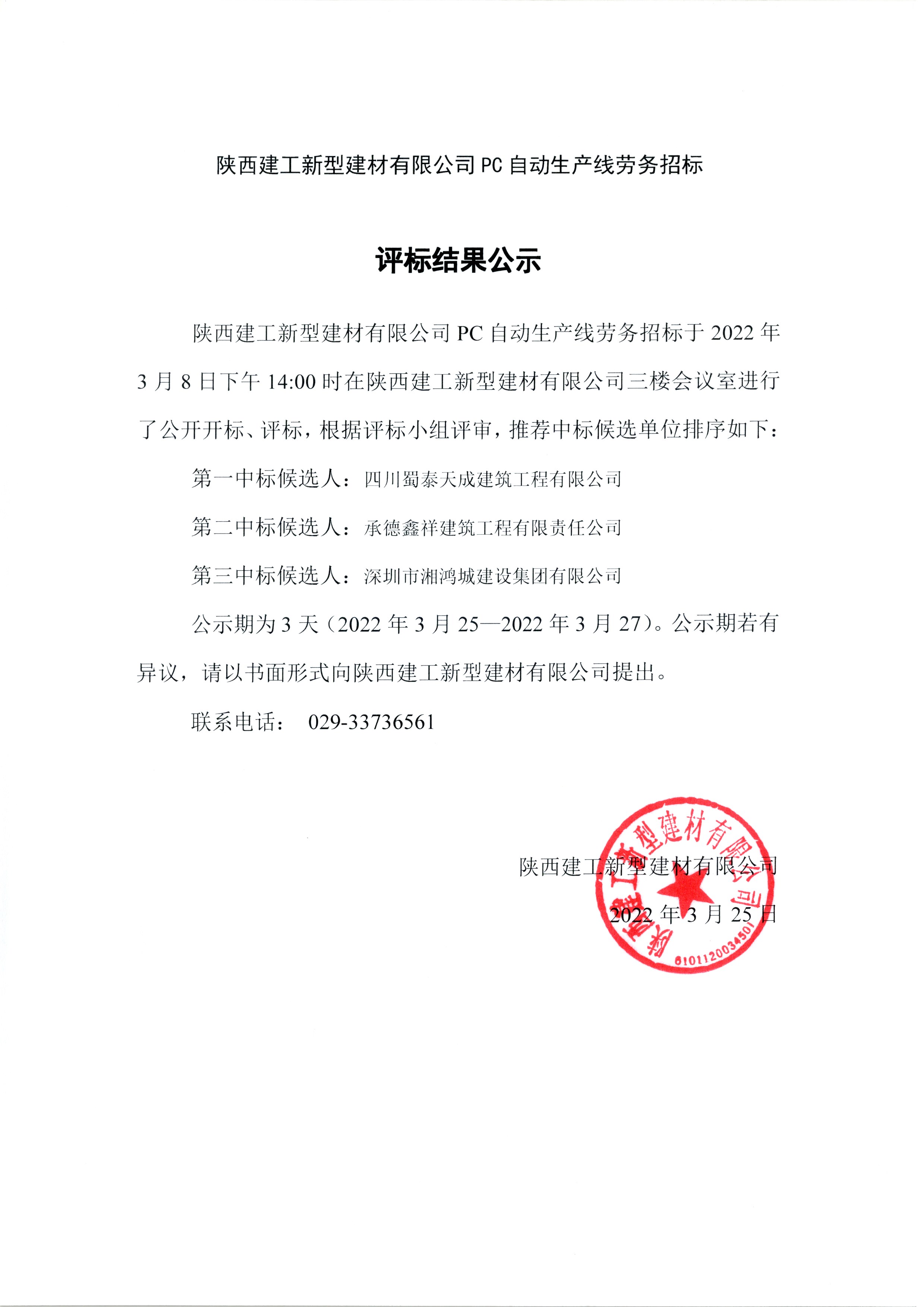 | 陜西建工新型建材有限公司PC自動生產(chǎn)線勞務(wù)招標(biāo)結(jié)果公示 |
