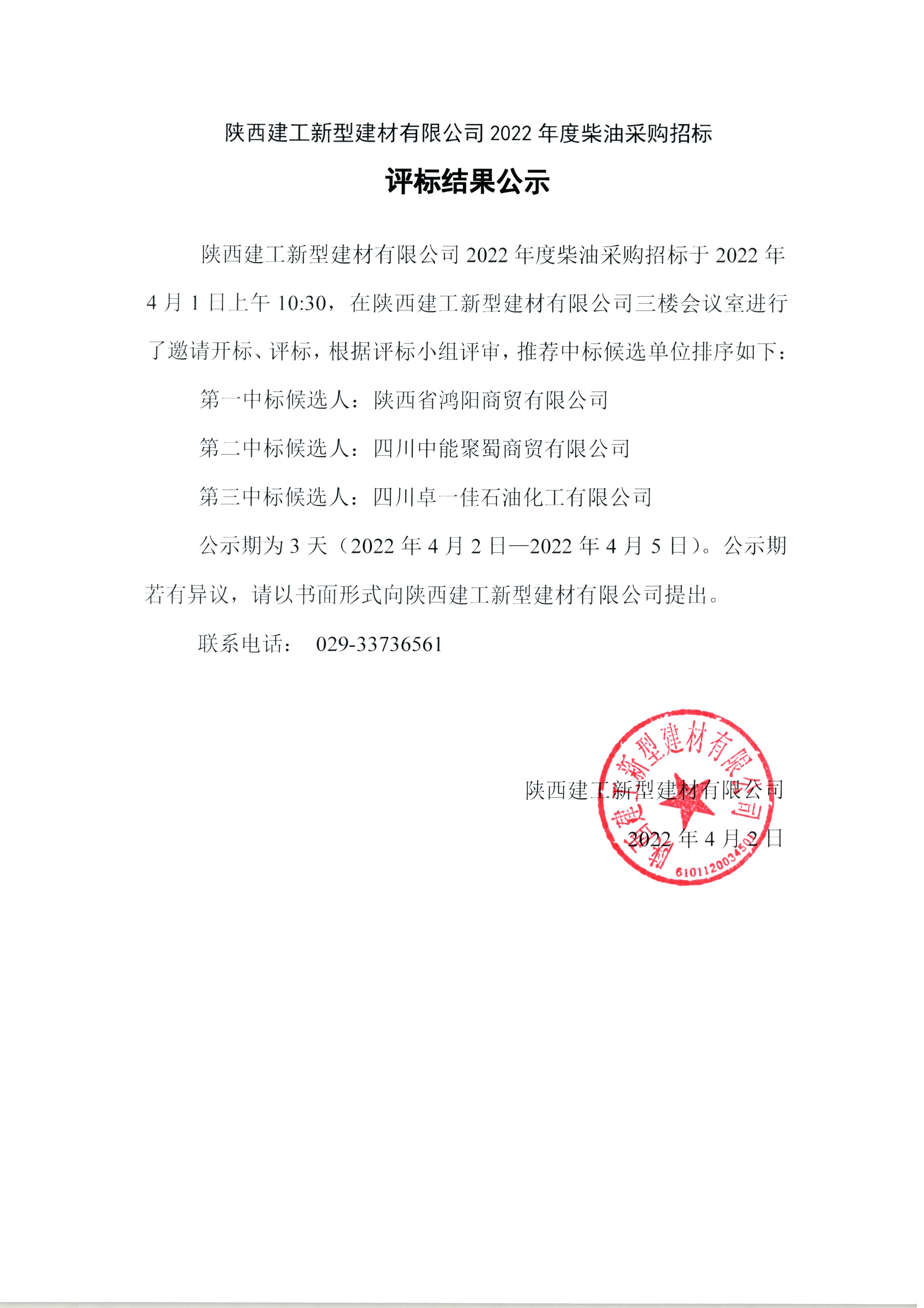 | 陜西建工新型建材有限公司2022年度柴油采購招標(biāo)結(jié)果公示 |