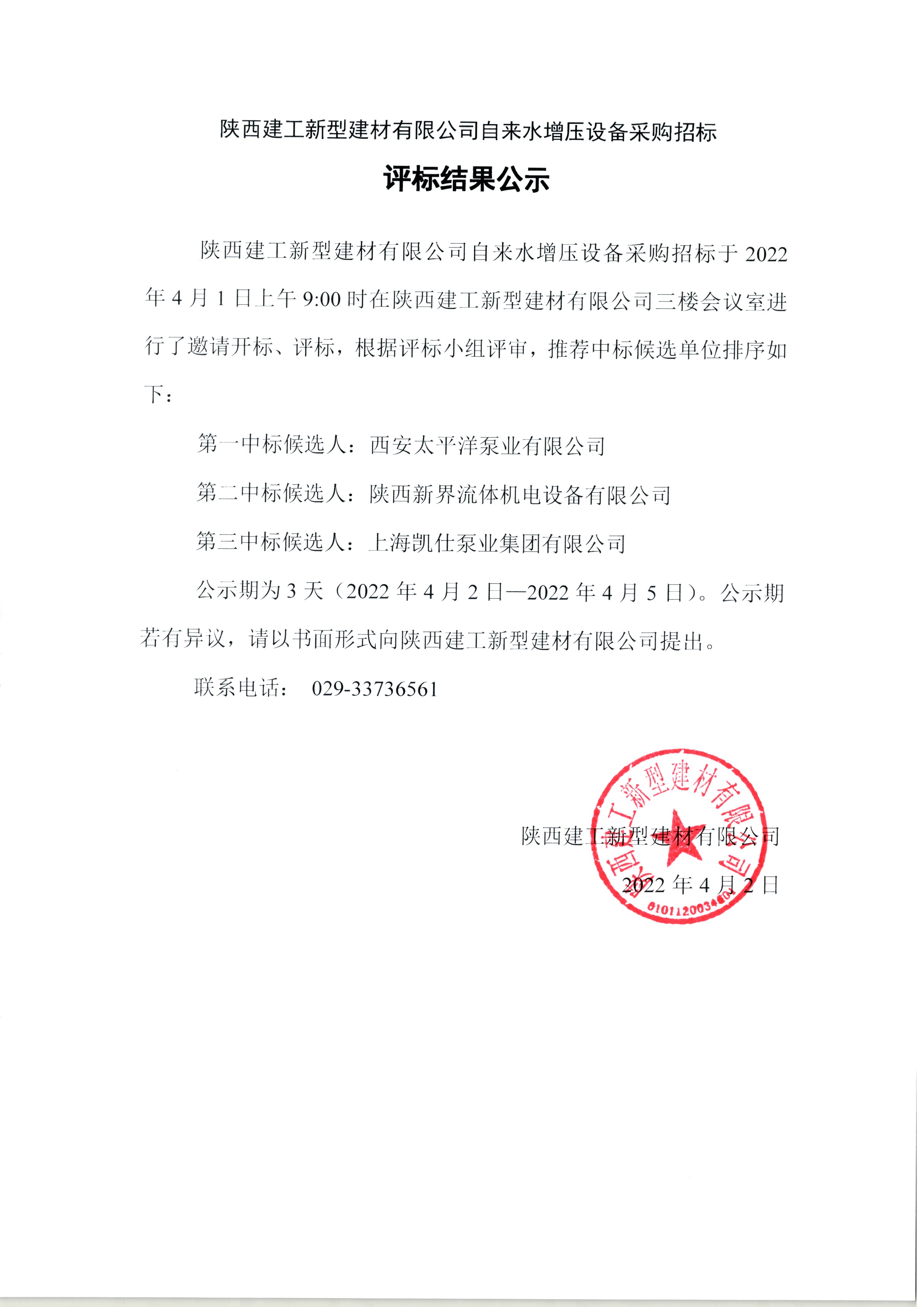 | 陜西建工新型建材有限公司自來水增壓設(shè)備采購招標(biāo)結(jié)果公示 |