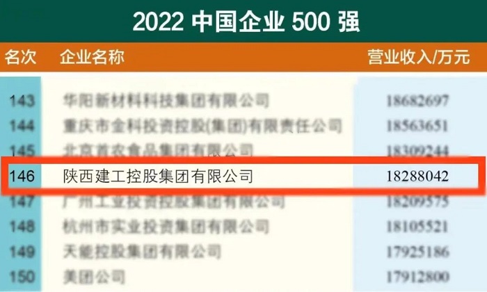 9月6日 中國企業(yè)聯(lián)合會、中國企業(yè)家協(xié)會發(fā)布 “2022中國企業(yè)500強”榜單 陜西建工控股集團位列 第146名 排名比上年提升 17位 在入榜的陜西企業(yè)里 位列第3名