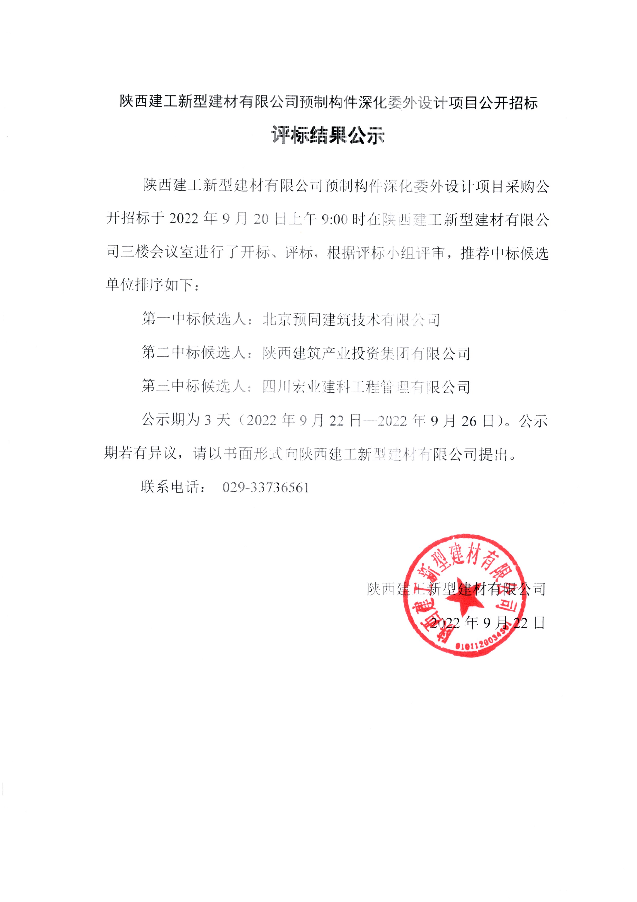 | 陜西建工新型建材有限公司預(yù)制構(gòu)件深化委外設(shè)計(jì)項(xiàng)目評(píng)標(biāo)結(jié)果公示 |