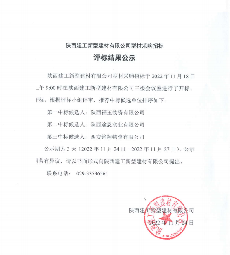 | 陜西建工新型建材有限公司型材采購(gòu)招標(biāo)評(píng)標(biāo)結(jié)果公示 |