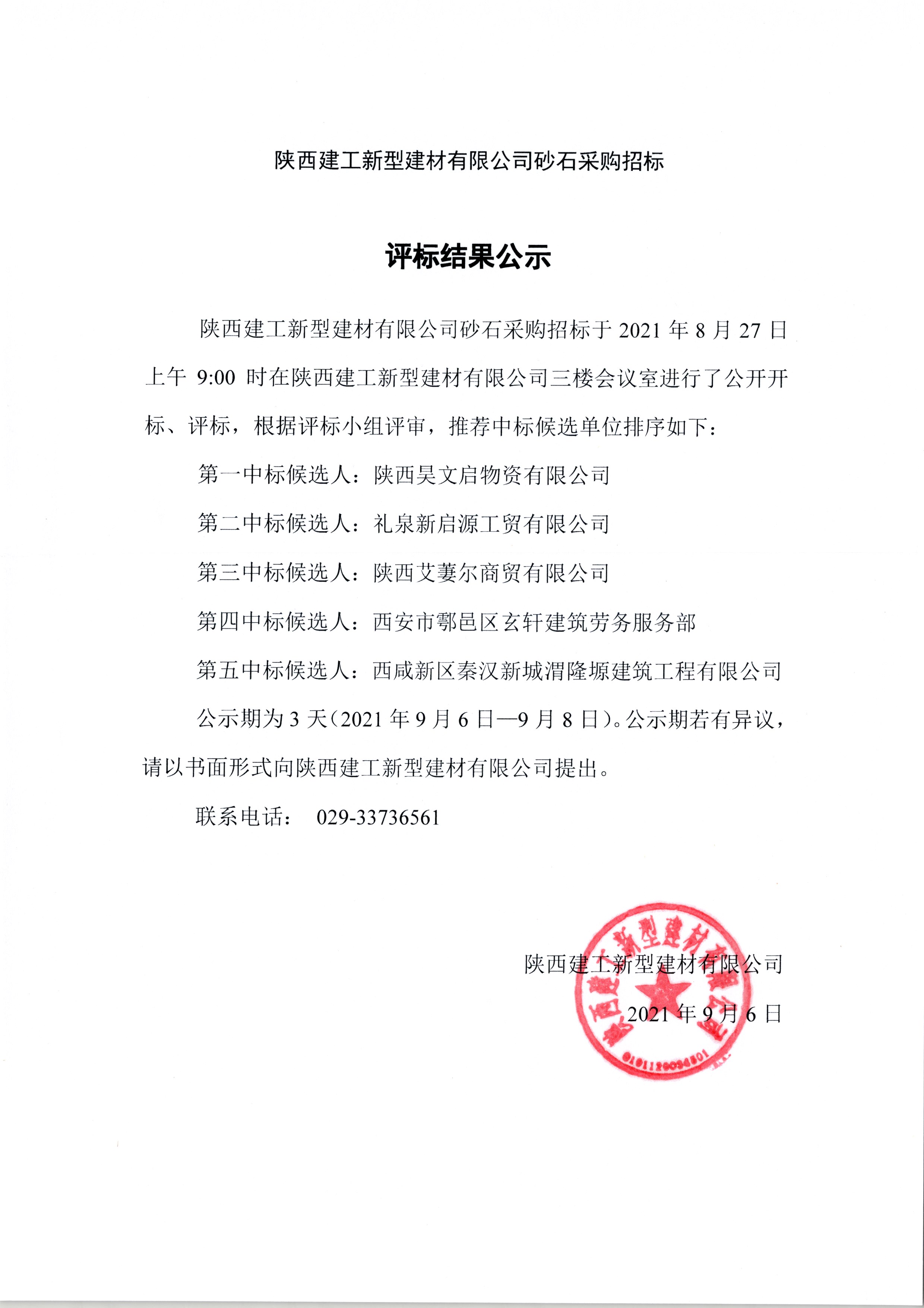 | 陜西建工新型建材有限公司砂石采購招標(biāo)評標(biāo)結(jié)果公示 |