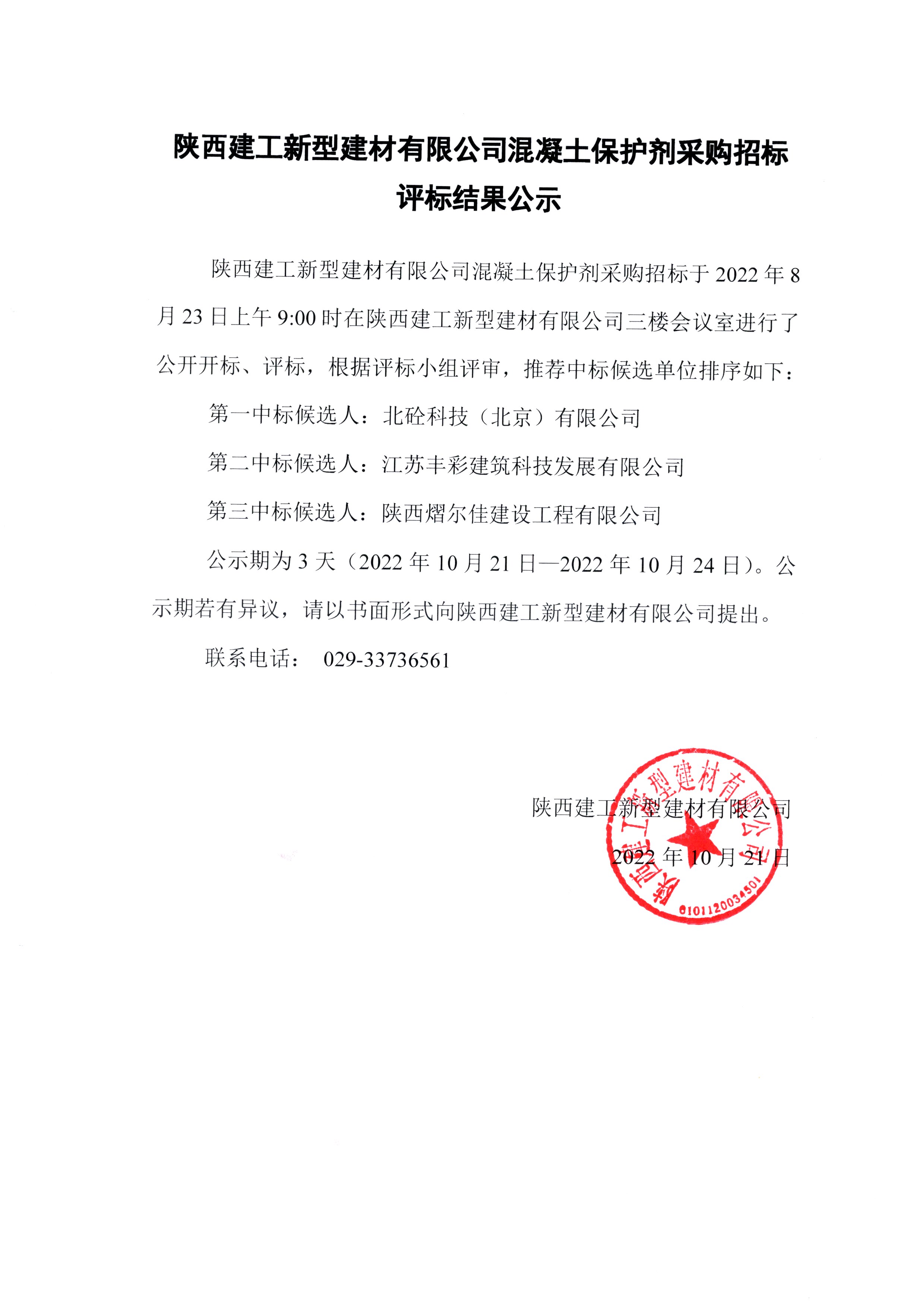 | 陜西建工新型建材有限公司混凝土保護(hù)劑采購招標(biāo)評標(biāo)結(jié)果公示 |