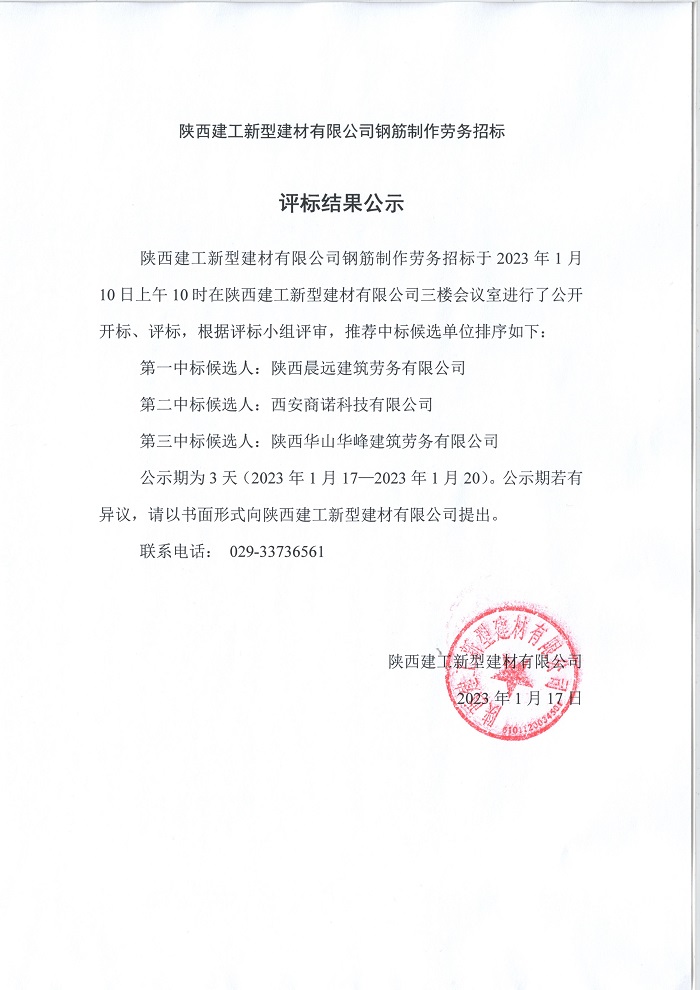 | 陜西建工新型建材有限公司鋼筋制作勞務(wù)招標(biāo)評(píng)標(biāo)結(jié)果公示 |